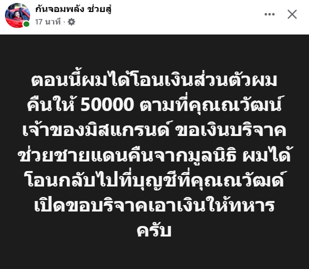 (29 ต.ค. 2568) จากกรณีที่ "กัน จอมพลัง" ได้โพสต์ข้อความเมื่อวันที่ 27 ต.ค. 2568 ว่า "ตอนนี้ผมได้โอนเงินส่วนตัวผมคืนให้ 50,000 ตามที่คุณณวัฒน์ เจ้าของมิสแกรนด์ ขอเงินบริจาคช่วยชายแดนคืนจากมูลนิธิ ผมได้โอนกลับไปที่บัญชีที่คุณณวัฒด์เปิดขอบริจาคเอาเงินให้ทหารครับ"