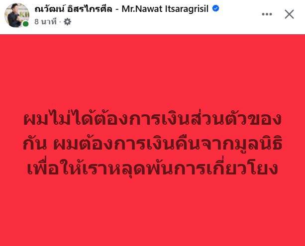 เวลาต่อมา บอสณวัฒน์ ได้โพสต์เพิ่มเติมว่า "เหมือนไม่ยอมฟังใคร พูดแล้ววันแถลงข่าวต่อหน้าว่าไม่เอาเงินจากคุณจะเอาเงินจากมูลนิธิ จะได้จบ"