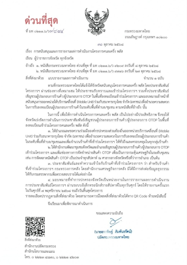4. มอบหมายที่ทำการปกครองจังหวัดเป็นหน่วยงานในการรายงานผลการดำเนินงานการประชาสัมพันธ์โครงการฯ ผ่านระบบอิเล็กทรอนิกส์รายสัปดาห์ในทุกวันศุกร์ โดยให้รายงานครั้งแรกในวันศุกร์ที่ 7 พฤศจิกายน 2568 จนถึงวันสิ้นสุดโครงการ