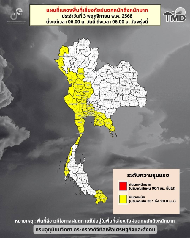 มีฝนฟ้าคะนอง ร้อยละ 60 ของพื้นที่ และมีฝนตกหนักบางแห่ง บริเวณจังหวัดระนอง และพังงา