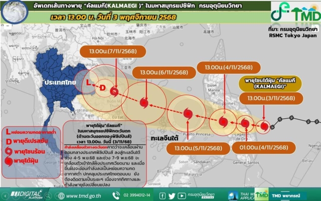 กรมอุตุนิยมวิทยา อัปเดต เส้นทางพายุ "คัลแมกี" บ่ายวันนี้ (3/11/68) ทวีกำลังแรงเป็น พายุไต้ฝุ่น แล้ว กำลังเคลื่อนตัวทางตะวันตก คาดว่าจะเคลื่อนผ่านตอนกลางประเทศฟิลิปปินส์ ลงสู่ทะเลจีนใต้ ช่วง 4-5 พ.ย. 2568 และช่วง 7-9 พ.ย. 2568 จะเคลื่อนตัวเข้าใกล้ฝั่งประเทศเวียดนาม และเมื่อขึ้นฝั่งแล้วจะอ่อนกำลังลงเป็นหย่อมความกดอากาศต่ำปกคลุมประเทศไทยตอนบน ยังต้องติดตามเป็นระยะๆ เนื่องจากทิศทางและกำลังพายุยังเปลี่ยนแปลง