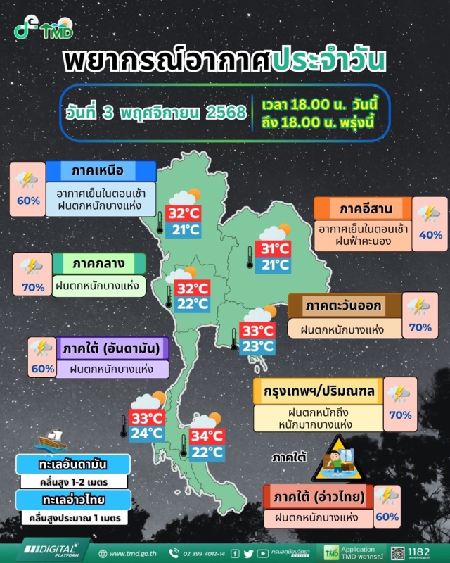 มีฝนฟ้าคะนอง ร้อยละ 60 ของพื้นที่ และมีฝนตกหนักบางแห่ง บริเวณจังหวัดระนอง และพังงา