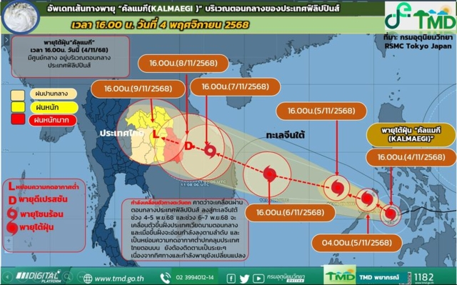 กรมอุตุนิยมวิทยา ประกาศเตือน เรื่อง พายุ "คัลแมกี" และฝนตกหนักถึงหนักมากบริเวณประเทศไทย ฉบับที่ 1 เมื่อเวลา 16.00 น. ของวันนี้ (4 พ.ย. 2568) พายุไต้ฝุ่น "คัลแมกี" (KALMAEGI) บริเวณประเทศฟิลิปปินส์ ได้เคลื่อนลงสู่ทะเลจีนใต้แล้ว โดยมีศูนย์กลางอยู่ที่ละติจูด 10.3 องศาเหนือ ลองจิจูด 121.3 องศาตะวันออก ความเร็วลมสูงสุดใกล้ศูนย์กลางประมาณ 120 กิโลเมตรต่อชั่วโมง กำลังเคลื่อนตัวทางทิศตะวันตกค่อนทางเหนือเล็กน้อย ด้วยความเร็วประมาณ 20 กิโลเมตรต่อชั่วโมง พายุนี้คาดว่าจะเคลื่อนขึ้นฝั่งบริเวณประเทศเวียดนามตอนกลางในช่วงวันที่ 6-7 พ.ย. 2568 หลังจากนั้นจะอ่อนกำลังลงเป็นพายุโซนร้อน และพายุดีเปรสชันตามลำดับ