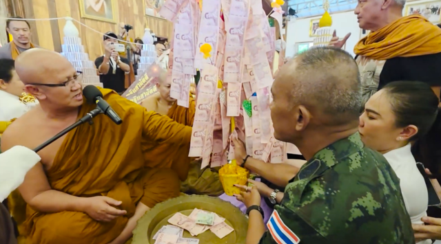 ขณะที่ นางจู่ ลูกศิษย์ชาวเวียงจันทร์ สปป.ลาว บอกว่า ตนเดินทางมาจากนครหลวงเวียงจันทน์ 38 คน ด้วยรถยนต์ 9 คัน นำเงินสด 670 ล้านกีบ หรือ 1 ล้านบาท มาร่วมบุญกับหลวงตา เพราะหลวงตาท่านพาสร้างบุญสร้างบารมี และคนไทยก็ให้การต้อนรับเป็นอย่างดี การกินการอยู่ก็สะดวกสบาย จัดการให้หมดทุกอย่างเพราะพี่น้องไทย-ลาวรักกัน