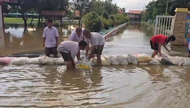 และเช้าวันนี้มีระดับสูงขึ้นกว่า 50 ซม. ทางเทศบาลต้องระดมเจ้าหน้าที่ และจิตอาสาเร่งกรอกกระสอบทรายอย่างเร่งด่วน และนำไปแจกจ่ายให้กับอาคารบ้านเรือนที่จะพยายามยื้อระดับที่สูงขึ้นให้เข้าอาคารบ้านเรือนให้น้อยที่สุด และอาคารบ้านเรือนที่ยังน้ำเข้าท่วมไม่ถึง เพื่อวางกระสอบทรายกัน ซึ่งระดับน้ำมีแนวโน้มสูงขึ้นอีก