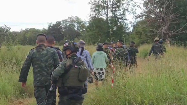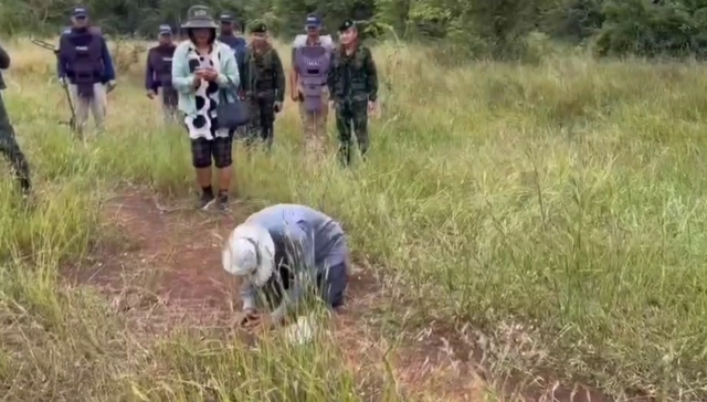 เมื่อเดินทางมาถึงพื้นที่กลางทุ่งนา ซึ่งปัจจุบันกลายเป็นทุ่งหญ้าและป่า พบว่ามีทหารกัมพูชาประจำการอยู่ในระยะห่างราว 200 เมตร ประมาณ 10–15 นาย แต่ไม่ได้แสดงท่าทีคุกคามใดๆ มีเพียงเดินลาดตระเวนอยู่ห่างๆ ขณะเดียวกัน จู่ๆก็มีเสียงเพลงลอยมาจากฝั่งกัมพูชาเป็นครั้งแรกที่เจ้าหน้าที่ได้ยินตั้งแต่เริ่มปฏิบัติการเก็บกู้ทุ่นระเบิด
