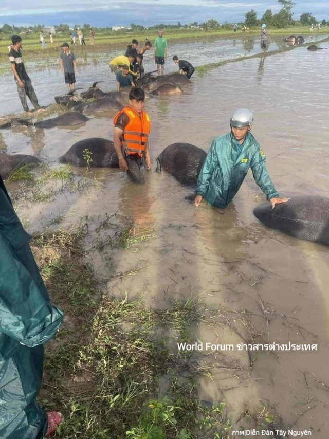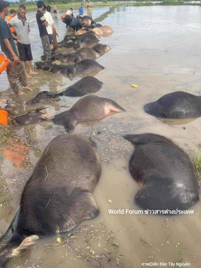 วันที่ 11 พ.ย. 68 เฟซบุ๊กเพจ “World Forum ข่าวสารต่างประเทศ” โพสต์ภาพควายจมน้ำตายเป็นจำนวนมาก พร้อมข้อความระบุว่า “เวียดนาม คัลแมกี จังหวัดดั๊กลัก ภาคกลางตอนใต้ หลังพายุลูกที่ 13 คัลแมกี”