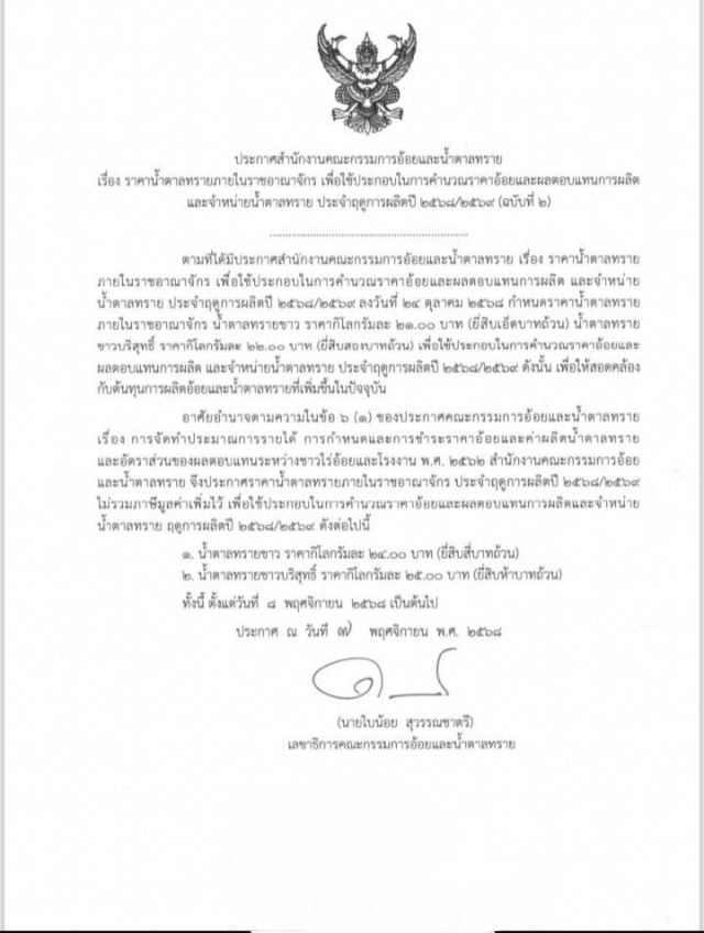 ตามที่ได้มีประกาศสำนักงานคณะกรรมการอ้อยและน้ำตาลทราย เรื่อง ราคาน้ำตาน้ำตาลทราย ภายในราชอาณาจักร เพื่อใช้ประกอบในการคำนวณราคาอ้อยและผลตอบแทนการผลิต และจำหน่ายน้ำตาลทราย ประจำฤดูการผลิตปี 2568/2569 ลงวันที่ 24 ตุลาคม 2568 กำหนดราคาน้ำตาตาลทรายภายในราชอาณาจักร น้ำตาลทรายขาว ราคากิโลกรัมละ 21.00 บาท (ยี่สิบเอ็ดบาทถ้วน) น้ำตาลทราย ขาวบริสุทธิ์ ราคากิโลกรัมละ 22.00 บาท (ยี่สิบสองบาทถ้วน) เพื่อใช้ประกอบในการคำนวณราคาอ้อยและผลตอบแทนการผลิต และจำหน่ายน้ำตาลทราย ประจำฤดูการผลิตปี 2568/2569 ดังนั้น เพื่อให้สอดคล้องฃกับต้นทุนการผลิตอ้อยและน้ำตาลทรายที่เพิ่มขึ้นในปัจจุบัน