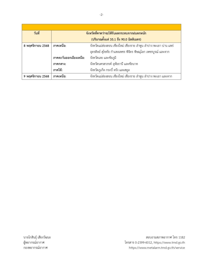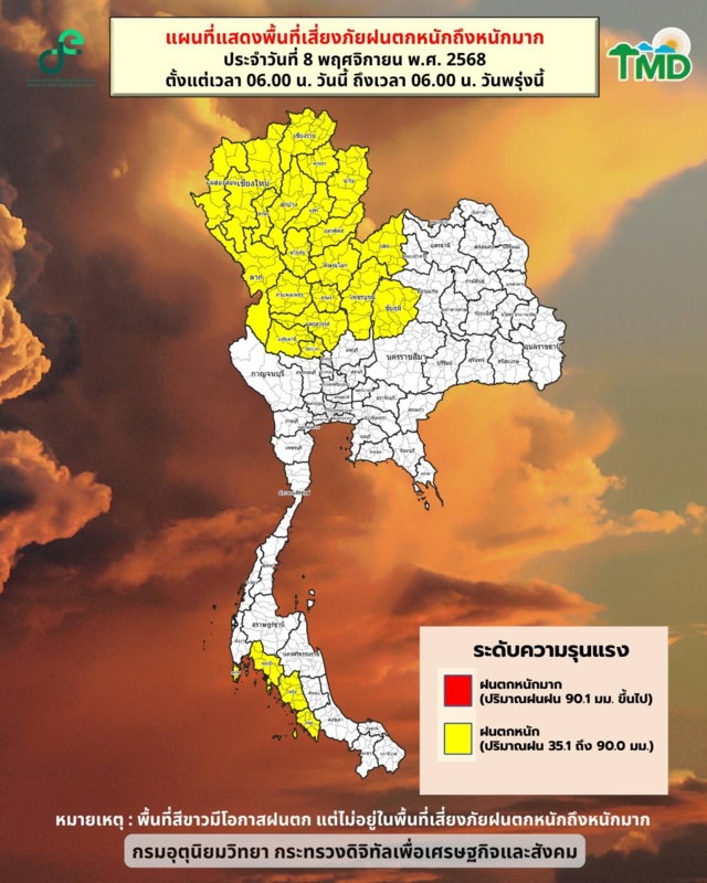 จากอิทธิพลดังกล่าว ส่งผลให้ในช่วงวันที่ 8-9 พ.ย. 2568 ประเทศไทยตอนบนมีฝนตกหนักบางพื้นที่ บริเวณด้านตะวันตกของภาคตะวันออกเฉียงเหนือ ภาคกลาง และภาคเหนือตามลำดับ ขอให้ประชาชนในบริเวณดังกล่าวระวังอันตรายจากฝนตกหนัก และฝนที่ตกสะสม ซึ่งอาจทำให้เกิดน้ำท่วมฉับพลัน น้ำป่าไหลหลาก และน้ำล้นตลิ่ง โดยเฉพาะพื้นที่ลาดเชิงเขาใกล้ทางน้ำไหลผ่าน พื้นที่ลุ่ม และพื้นที่น้ำท่วมขัง สำหรับเกษตรกรควรป้องกันและระวังความเสียหายที่จะเกิดต่อผลผลิตทางการเกษตร