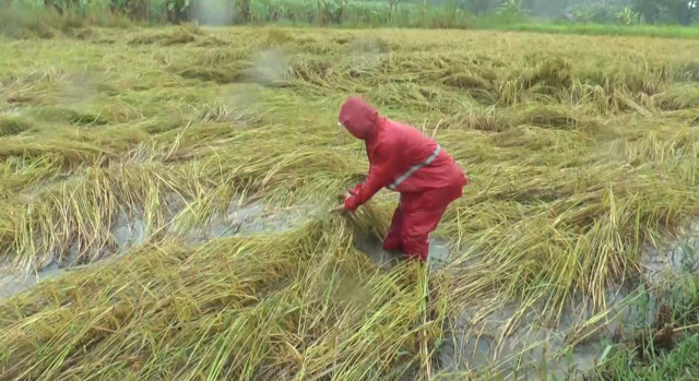ด้าน นายทองคูณ ชาวนาในตำบลหนองตาดอีกคน บอกว่า ทำนาทั้งหมดกว่า 10 ไร่ เกี่ยวไปแล้วประมาณ 2 ไร่ แต่พอฝนตกติดต่อกันสองวันและมีลมกระโชกแรง ทำให้ต้นข้าวที่ยังไม่ได้เก็บเกี่ยวล้มและรวงแช่น้ำ ซึ่งหากฝนหยุดก็สามารถเกี่ยวขึ้นไปตากลดความชื้นได้ แต่ถ้าฝนไม่หยุดและรวงข้าวแช่น้ำหลายวันก็จะเน่าเสียหาย ซึ่งหากผลผลิตเสียหายก็อยากให้รัฐชดเชยเยียวยาด้วย เพราะเดือดร้อนต้องลงทุนทั้งค่าไถ ปุ๋ย และเมล็ดพันธุ์ แต่พอถึงช่วงเก็บเกี่ยวกลับถูกพายุเสียหาย