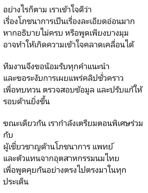 และขอระงับการเผยแพร่คลิปชั่วคราว เพื่อทบทวน ตรวจสอบข้อมูล และปรับแก้ให้รอบด้านยิ่งขึ้น ขณะเดียวกัน เรากำลังเตรียมตอนพิเศษร่วมกับ ผู้เชี่ยวชาญด้านโภชนาการ แพทย์