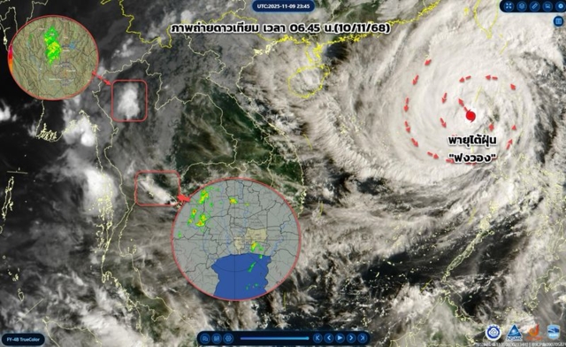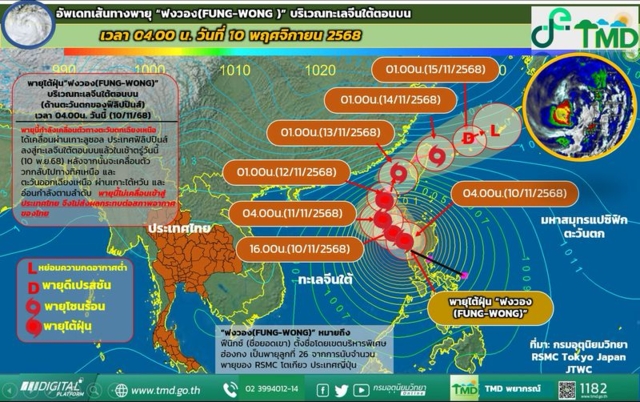 อัปเดตเส้นทางพายุไต้ฝุ่น "ฟงวอง" (FUNG-WONG) เช้าวันนี้ (10 พ.ย. 2568) พายุนี้ได้เคลื่อนผ่านเกาะลูซอล ประเทศฟิลิปปินส์ ลงสู่ทะเลจีนใต้ตอนบนแล้ว กำลังเคลื่อนตัวทางตะวันตกเฉียงเหนือ ค่อนไปทางเหนือในเช้าตรู่วันนี้ (10 พ.ย. 2568) หลังจากนั้นจะเคลื่อนตัววกกลับไปทางทิศเหนือ และตะวันออกเฉียงเหนือ เนื่องจากเป็นช่วงที่มวลอากาศเย็นจะแผ่ลงมาปกคลุมประเทศจีนตอนใต้ คาดว่าจะเคลื่อนผ่านเกาะไต้หวัน และอ่อนกำลังตามลำดับ พายุนี้ไม่เคลื่อนเข้าสู่ประเทศไทย จึงไม่ส่งผลกระทบต่อสภาพอากาศของไทย จึงไม่น่ากังวลและวิตก