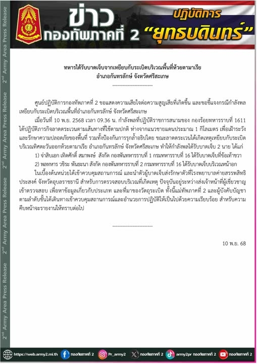 เมื่อวันที่ 10 พ.ย. 2568 เวลา 09.36 น. กำลังพลที่ปฏิบัติราชการสนามของ กองร้อยทหารราบที่ 1611 ได้ปฏิบัติภารกิจลาดตระเวนตามเส้นทางที่ใช้ตามปกติ ห่างจากแนวชายแดนประมาณ 1 กิโลเมตร เพื่อเฝ้าระวังและรักษาความปลอดภัยของพื้นที่ รวมทั้งป้องกันการรุกล้ำอธิปไตย ขณะลาดตระเวนได้เกิดเหตุเหยียบกับระเบิดบริเวณทิศตะวันออกห้วยตามาเรีย อำเภอกันทรลักษ์ จังหวัดศรีสะเกษ ทำให้กำลังพลได้รับบาดเจ็บ 2 นาย ได้แก่