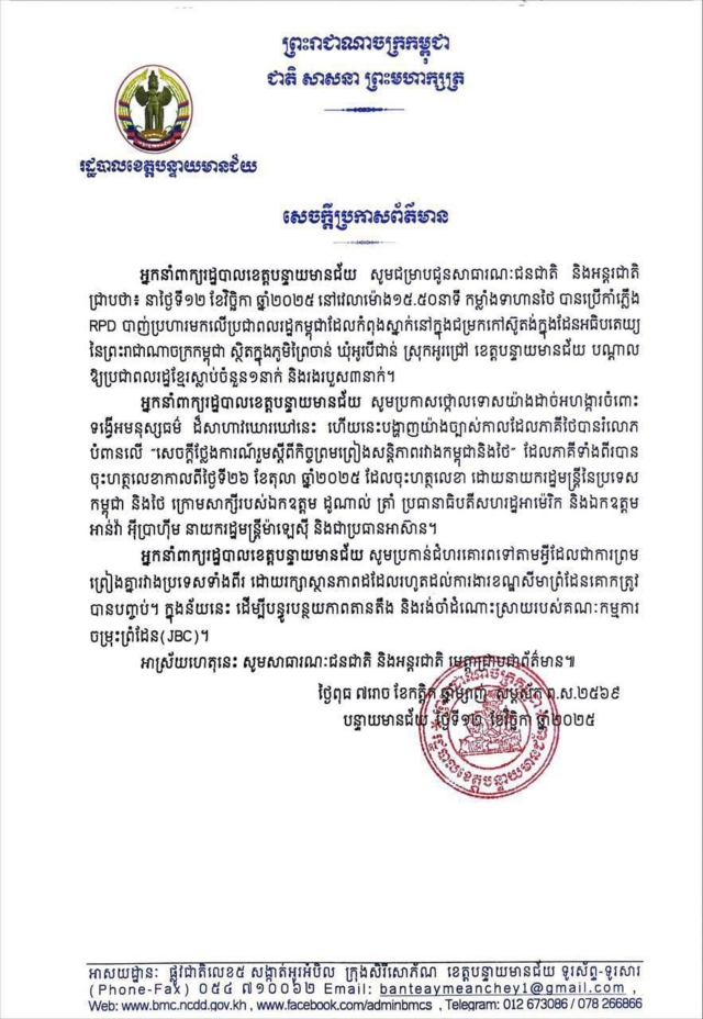 วันที่ 12 พ.ย.2568 จังหวัดบันเตียเมียนเจย ออกแถลงการณ์ อ้างว่า เมื่อวันที่ 12 พ.ย. 2025 เวลาประมาณ 16.03 น. ได้เกิดเหตุการณ์ทหารไทย ใช้อาวุธยิงเข้าใส่พื้นที่หมู่บ้านเปรยจัน ตำบลออเบี๊ยจัน อำเภอออจเรา จังหวัดบันเตียเมียนเจย ส่งผลให้ชาวกัมพูชาคนหนึ่งเสียชีวิตในที่เกิดเหตุ โดยเหตุเกิดขึ้นในพื้นที่ฝั่งกัมพูชา