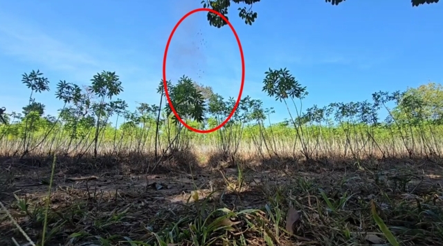 ผู้สื่อข่าวสอบถามนายลือชัย เจ้าของไร่มันสำปะหลัง บอกว่า ตนเองพบเห็นรูต้องสงสัยจุดนี้มาตั้งแต่หลังเกิดหลังเกิดการประทะรอบแรก ตอนนั้นเข้าใจว่าเป็นร่องน้ำธรรมดา เนื่องจากตนเองเดินตกลงไปในรูดังกล่าวตอนมาฉีดยาในไร่มันสำปะหลัง แต่นึกย้อนไปพบว่า ไร่ตนเองนั้นไม่มีร่องน้ำและรากไม้ จึงแจ้งกับผู้นำชุมชนว่า สงสัยว่าจะเป็นระเบิดหรือวัตถุแปลกปลอมเนื่องจากเนื่องจาก ห่างออกไป 200 เมตร ก็เคยพบเคยพบจรวดหัวรบที่ทำงานแล้ว เช่นกัน ซึ่งวันนี้เจ้าหน้าที่มาตรวจสอบก็รู้สึกดีใจ เพราะจะได้ปลอดภัยส่วนสถานการณ์การสู้รบรอบใหม่ ตนเองก็พร้อมที่จะให้เจ้าหน้าที่สู้รบได้หลังจากการเก็บเกี่ยวข้าว