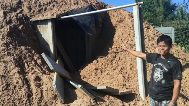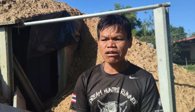 ขณะที่นายสุธีร์ บุญแต่ง อายุ 60 ปี ปู่ของน้องน้ำโขง หรือ ด.ช.ธิติวัฒน์ บุญแต่ง อายุ 8 ขวบ ที่เสียชีวิตจากจรวด BM21 ของทหารกัมพูชายิงมาใส่เมื่อวันที่ 24 พ.ย.68 ที่ผ่านมา ได้พาผู้สื่อข่าวดูหลุ่มหลบภัยหรือบังเกอร์ที่ กัน จอมพลัง มาสร้างไว้ให้แต่ยังไม่แล้วเสร็จ เนื่องจากถูกเหตุการณ์ดรามาและถูกโจมตีจาก สส.ไอช์ รัชนก ที่ผ่านมา ตามที่เป็นข่าว