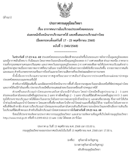 วันที่ 15 พ.ย. 68 กรมอุตุนิยมวิทยา ออกประกาศ เรื่อง อากาศหนาวเย็นบริเวณประเทศไทยตอนบน ฝนตกหนักถึงหนักมากบริเวณภาคใต้ และคลื่นลมแรงบริเวณอ่าวไทย ฉบับที่ 1