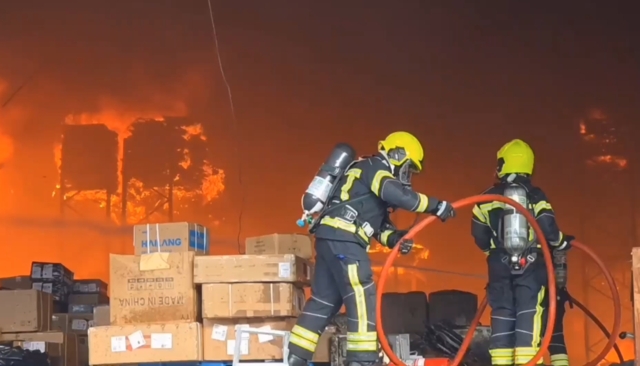 โดยช่วยกันระดมฉีดน้ำดับเพลิงที่กำลังลุกไหม้อยู่ภายในโกดังที่มีเนื้อที่ประมาณ 1 ไร่เศษ ซึ่งไฟได้โหมลุกลามไหม้สิ่งของเครื่องใช้ภายในโกดังจนวอดเกือบหมด อีกทั้งโครงหลังคาพร้อมชิ้นส่วนได้ถล่มลงมาเป็นระยะ เจ้าหน้าที่ต้องกันผู้ไม่เกี่ยวข้องออกมา เกรงจะเกิดอันตราย โดยใช้เวลาประมาณ 2 ชั่วโมง จึงสามารถควบคุมเพลิงอยู่ในวงจำกัด