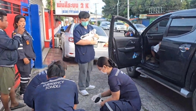 เมื่อเวลาประมาณ 06.30 น. วันที่ 17 พ.ย. 68 วิทยุแจ้งเหตุหน่วยกู้ภัยสว่างประทีปศรีราชา จ.ชลบุรี ได้รับแจ้งเหตุขอความช่วยเหลือ มีสาวท้องจะคลอดลูกในรถ ขณะนี้อยู่บนรถกระบะมิตซูบิชิ ไทรทัน สีดำ หมายเลขทะเบียน จก 4213 ชลบุรี จอดอยู่ริมถนนสาย 9 กิโล ปากทางเข้าโครงการบ้านเอื้ออาทร 9 กิโล หมู่ 3 ต.สุรศักดิ์ อ.ศรีราชา จ.ชลบุรี จึงประสานรถพยาบาลกู้ชีพ “ลั่นทม” โรงพยาบาลสมเด็จพระบรมราชเทวี ณ ศรีราชา เข้าร่วมตรวจสอบ