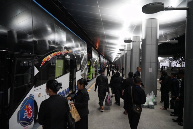 ซึ่งมีประชาชนจาก จ.กระบี่ กาญจนบุรี กาฬสินธุ์ และกำแพงเพชร รวม 3,000 คน เดินทางโดยรถบัส และมีตำรวจทางหลวงนำขบวนและปิดท้ายขบวน พร้อมเจ้าหน้าที่ อาสาสมัครสาธารณภัย ดูแลความเรียบร้อยตลอดเส้นทาง ทั้งการบริการอาหารว่างและเครื่องดื่มบริเวณจุดพักระหว่างทาง และจุดพักคอยก่อนเข้าพื้นที่กรุงเทพมหานคร โดยเมื่อเดินทางถึงจุดรับ-ส่งประชาชน บริเวณหน้าพระธาตุ จะมีเจ้าหน้าที่กองอาสารักษาดินแดน (อส.) กระทรวงมหาดไทย คอยดูแลอำนวยความสะดวกตั้งแต่เดินทางมาถึง การเข้ากราบบังคมพระบรมศพ และส่งขึ้นรถกลับภูมิลำเนา