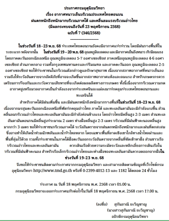 วันที่ 18 พ.ย. 68 กรมอุตุนิยมวิทยา ออกประกาศเตือนฉบับที่ 7 เรื่อง อากาศหนาวเย็นบริเวณประเทศไทยตอนบน ฝนตกหนักถึงหนักมากบริเวณภาคใต้ และคลื่นลมแรงบริเวณอ่าวไทย มีผลกระทบจนถึงวันที่ 23 พฤศจิกายน 2568