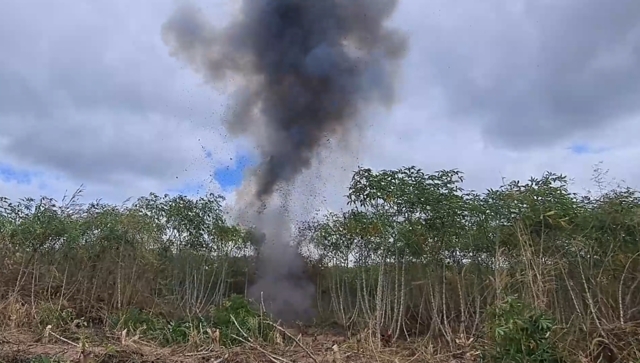 วันที่ 18 พ.ย.2568 เจ้าหน้าที่ EOD กองกำกับการสืบสวนตำรวจภูธรจังหวัดอุบลราชธานี และเจ้าหน้าที่ EOD กองกำกับการตำรวจตระเวนชายแดนที่ 22 ผู้นำชุมชนฝ่ายปกครองร่วมกันทำลายหัวจรวด BM-21 ของทางทหารกัมพูชา ยิงเข้ามาตกในไร่มันสัมปะหลังบ้านโนนอุดม ต.โคกสะอาด อ.น้ำขุ่น จ.อุบลราชธานี
