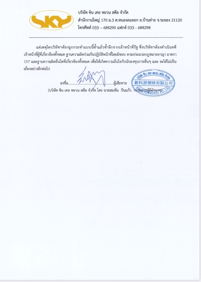 “เหตุใดบริษัทฯต้องถูกกระทำแบบนี้ซ้ำแล้วซ้ำอีกจากเจ้าหน้าที่รัฐ ซึ่งบริษัทฯ จะดำเนินคดีหน้าที่ผู้เกี่ยวข้องทั้งหมด ฐานความผิดร่วมกันปฏิบัติหน้าที่โดยมิชอบ ตามประมวลกฎหมายอาญา มาตรา 157 และฐานความผิดอื่นใดที่เกี่ยวข้องทั้งหมด เพื่อให้เกิดความมั่นใจกับนักลงทุนรายอื่นๆ” นายเขมพัสตร์ ระบุ