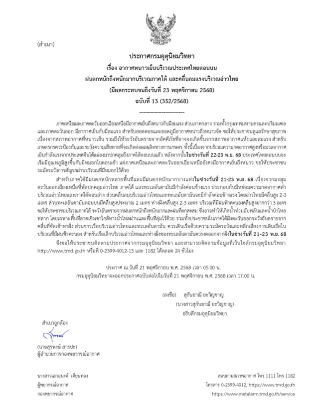 กรมอุตุนิยมวิทยา ประกาศเตือน เรื่อง อากาศหนาวเย็นบริเวณประเทศไทยตอนบน ฝนตกหนักถึงหนักมากบริเวณภาคใต้ และคลื่นลมแรงบริเวณอ่าวไทย (มีผลกระทบจนถึงวันที่ 23 พ.ย. 2568) ฉบับที่ 13 ภาคเหนือและภาคตะวันออกเฉียงเหนือมีอากาศเย็นถึงหนาวกับมีลมแรง ส่วนภาคกลาง รวมทั้งกรุงเทพมหานครและปริมณฑล และภาคตะวันออก มีอากาศเย็นกับมีลมแรง สำหรับยอดดอยและยอดภูมีอากาศหนาวถึงหนาวจัด ขอให้ประชาชนดูแลรักษาสุขภาพ เนื่องจากสภาพอากาศที่หนาวเย็น รวมถึงให้ระวังอันตรายจากอัคคีภัยที่อาจจะเกิดขึ้นจากสภาพอากาศแห้งและลมแรง สำหรับเกษตรกรควรป้องกันและระวังความเสียหายที่จะเกิดต่อผลผลิตทางการเกษตร