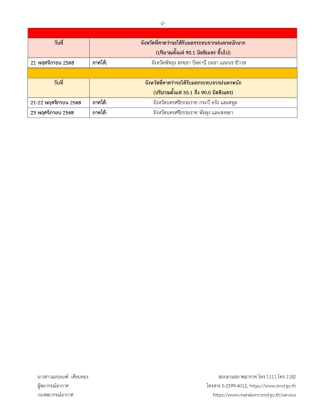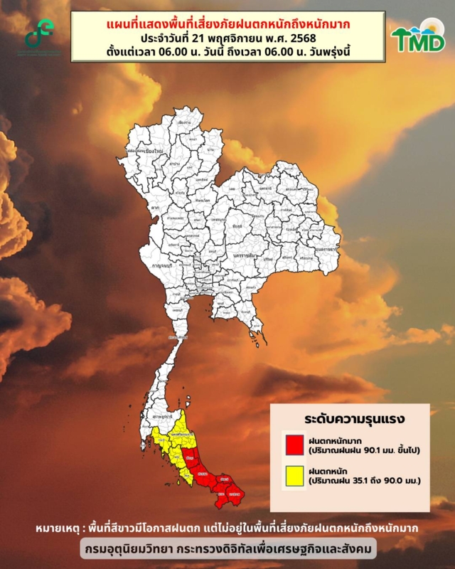 สำหรับภาคใต้มีฝนตกหนักหลายพื้นที่และมีฝนตกหนักมากบางแห่งในช่วงวันที่ 21-23 พ.ย. 2568 เนื่องจากมรสุมตะวันออกเฉียงเหนือที่พัดปกคลุมอ่าวไทย ภาคใต้ และทะเลอันดามันมีกำลังค่อนข้างแรง ประกอบกับมีหย่อมความกดอากาศต่ำบริเวณอ่าวไทยและภาคใต้ตอนล่าง ส่วนคลื่นลมบริเวณอ่าวไทยและทะเลอันดามันจะมีกำลังค่อนข้างแรง โดยอ่าวไทยมีคลื่นสูง 2-3 เมตร ส่วนทะเลอันดามันตอนบนมีคลื่นสูงประมาณ 2 เมตร ห่างฝั่งคลื่นสูง 2-3 เมตร บริเวณที่มีฝนฟ้าคะนองคลื่นสูงมากกว่า 3 เมตร ขอให้ประชาชนบริเวณภาคใต้ ระวังอันตรายจากฝนตกหนักถึงหนักมากและฝนที่ตกสะสม ซึ่งอาจทำให้เกิดน้ำท่วมฉับพลันและน้ำป่าไหลหลาก โดยเฉพาะพื้นที่ลาดเชิงเขาใกล้ทางน้ำไหลผ่านและพื้นที่ลุ่มไว้ด้วย รวมทั้งประชาชนในภาคใต้ฝั่งตะวันออกระวังอันตรายจากคลื่นที่ซัดเข้าหาฝั่ง