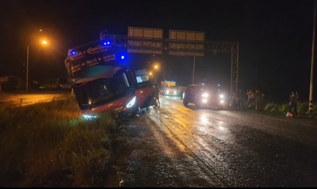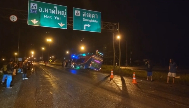 เมื่อเวลาประมาณ 22.00 น. วันที่ 20 พ.ย. 68 เจ้าหน้าที่ตำรวจ สภ.ควนมีด จ.สงขลา รับแจ้งเหตุอุบัติเหตุรถทัวร์โดยสารเสียหลักตกถนน ลงไปในร่องน้ำกลางถนนสายเอเชียขาขึ้น ในพื้นที่ ต.คลองเปียะ อ.จะนะ จ.สงขลา