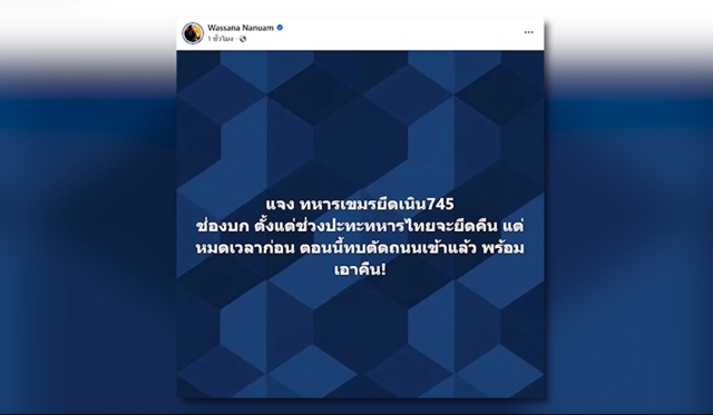 วันที่ 21 พ.ย. 68 น.ส.วาสนา นาน่วม ผู้สื่อข่าวอาวุโสสายทหาร โพสต์ข้อความลงในเฟซบุ๊กเพจ “Wassana Nanuam” ระบุว่า “แจง ทหารเขมรยึดเนิน745 ช่องบก ตั้งแต่ช่วงปะทะทหารไทยจะยึดคืน แต่หมดเวลาก่อน ตอนนี้ทบตัดถนนเข้าแล้ว พร้อมเอาคืน!”