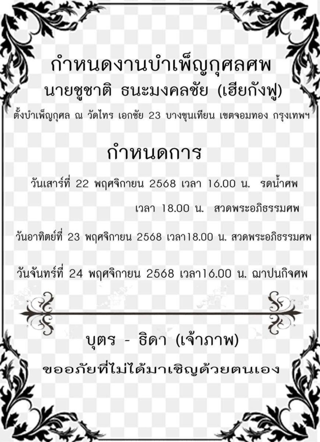 สำหรับกำหนดการบำเพ็ญกุศลศพของ "ชูชาติ ธนะมงคลชัย" ตั้งบำเพ็ญกุศาล ณ วัดไทย เอกชัย 23 แขวางบางขุนเทียน เขตจอมทอง กรุงเทพฯ โดยพิธีรดน้ำศพจัดในวันที่ 22 พฤศจิกายน 2568 และสวดอภิธรรมในวันที่ 22-23 พฤศจิกายน 2568 ส่วนพิธีฌาปานกิจจัดขึ้นในที่ 24 พฤศจิกายน 2568