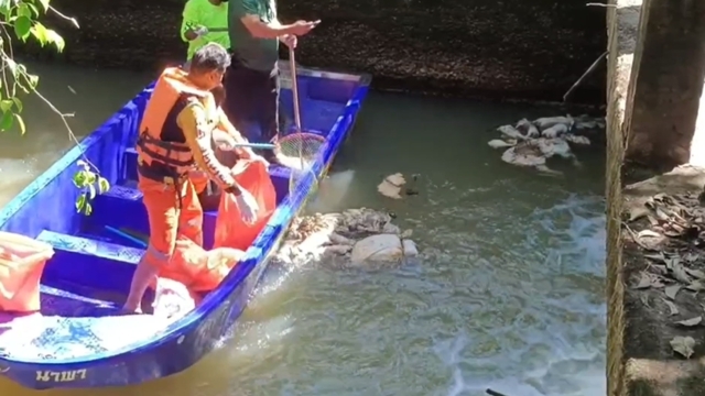 พบซากลูกหมูเกือบร้อยตัวลอยอยู่ในคลอง จึงประสานเจ้าหน้าที่กู้ภัยสมาคมพุทธศาสตร์สงเคราะห์อำเภอแกลง นำเรือเก็บซากลูกหมูขึ้นจากคลองวังหว้า