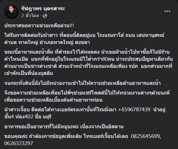 ล่าสุดผู้ใช้เฟซบุ๊ก ‘รัชฎาพร บุตรสาระ’ โพสต์ข้อความระบุว่าประกาศขอความข่วยเหลือด่วน!!!