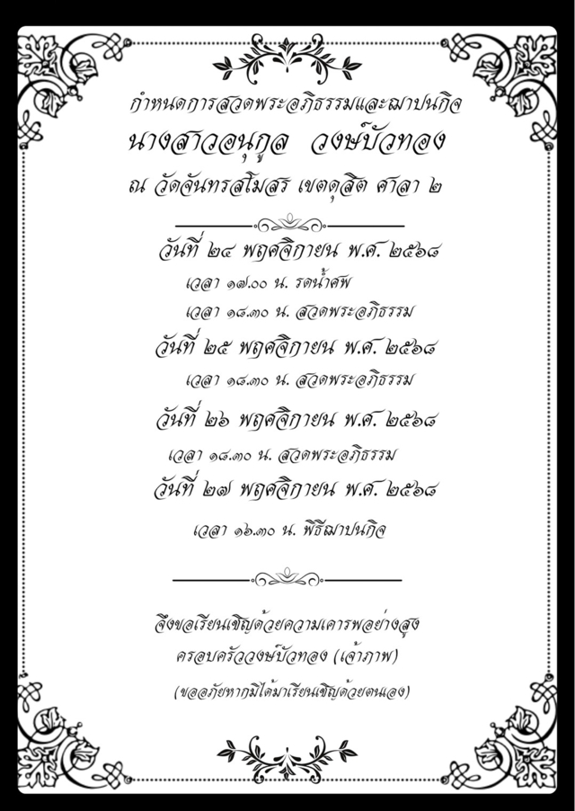 โดยทางญาติได้กำหนดพิธีสวดพระอภิธรรม ที่วัดจันทร์สโมสร บางกระบือ ศาลา 2 ตั้งแต่วันที่ 24-26 พ.ย. 68 และมีกำหนดฌาปนกิจในวันที่ 27 พ.ย. 68 เวลา 16.30 น.