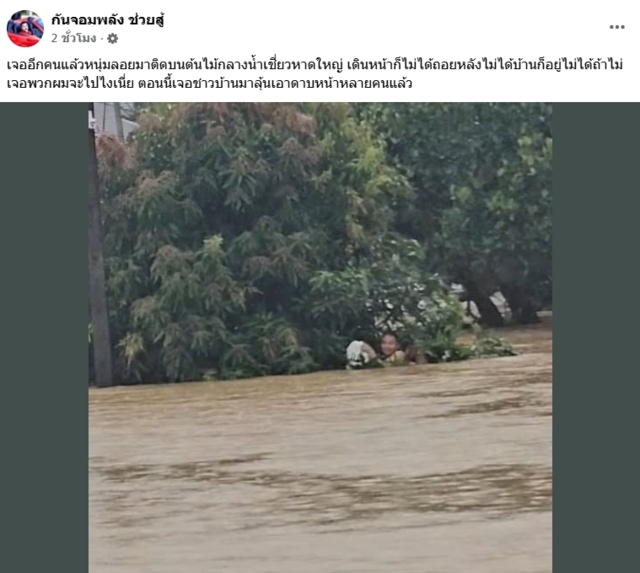 ขณะที่เพจ “กัน จอมพลังช่วยสู้” โพสต์ข้อความพร้อมกับภาพผู้ประสบภัยลอยคอเกาะกับต้นไม้ พร้อมระบุข้อความว่า “เจออีกคนแล้วหนุ่มลอยมาติดบนต้นไม้กลางน้ำเชี่ยวหาดใหญ่ เดินหน้าก็ไม่ได้ถอยหลังไม่ได้บ้านก็อยู่ไม่ได้ถ้าไม่เจอพวกผมจะไปไงเนี่ย ตอนนี้เจอชาวบ้านมาลุ้นเอาดาบหน้าหลายคนแล้ว”
