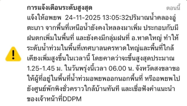 วันที่ 24 พ.ย.2568 เพจ Pr.Songkhla ประชาสัมพันธ์จังหวัดสงขลา โพสต์ข้อความระบุว่า ปภ.เตือนระดับสูงสุด แจ้งให้อพยพ 24-11-2025 13:05:32ปริมาณน้ำคลองอู่ ตะเภา จากพื้นที่เหนือน้ำยังคงไหลลงมาเพิ่ม ประกอบกับมี ฝนตกเพิ่มในพื้นที่ และยังคงมีกลุ่มฝนที่ อ.หาดใหญ่ ทำให้ ระดับน้ำท่วมในพื้นที่เทศบาลนครหาดใหญ่และพื้นที่ใกล้เคียงเพิ่มสูงขึ้นในเวลานี้