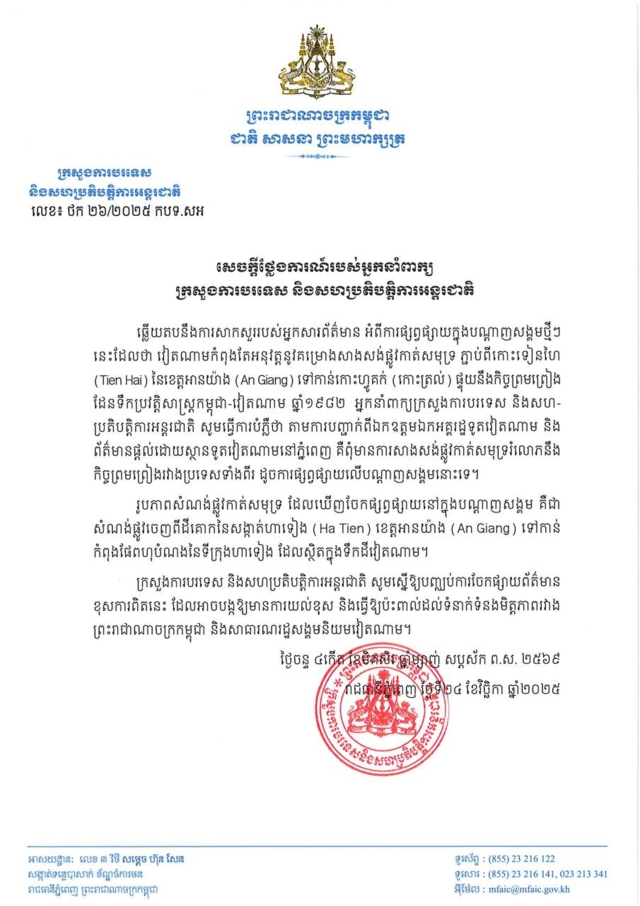 กระทรวงการต่างประเทศและความร่วมมือระหว่างประเทศ ขอให้ยุติการเผยแพร่ข้อมูลที่ผิดพลาดนี้ เนื่องจากอาจนำไปสู่ความเข้าใจผิดที่ส่งผลกระทบในทางลบต่อความสัมพันธ์ฉันมิตรระหว่างราชอาณาจักรกัมพูชาและสาธารณรัฐสังคมนิยมเวียดนาม