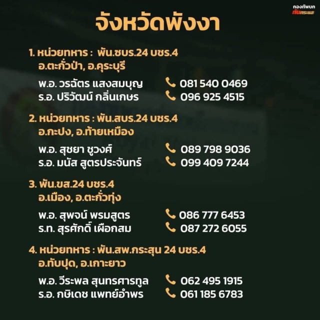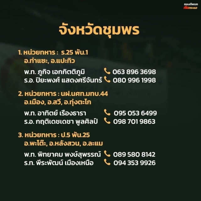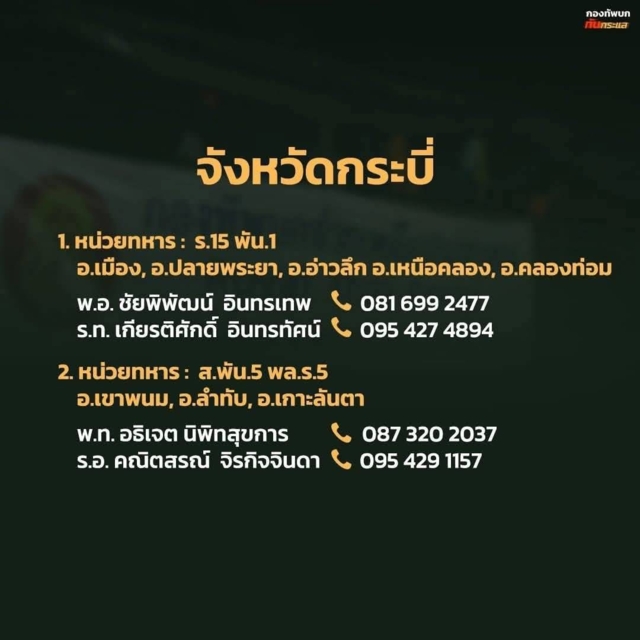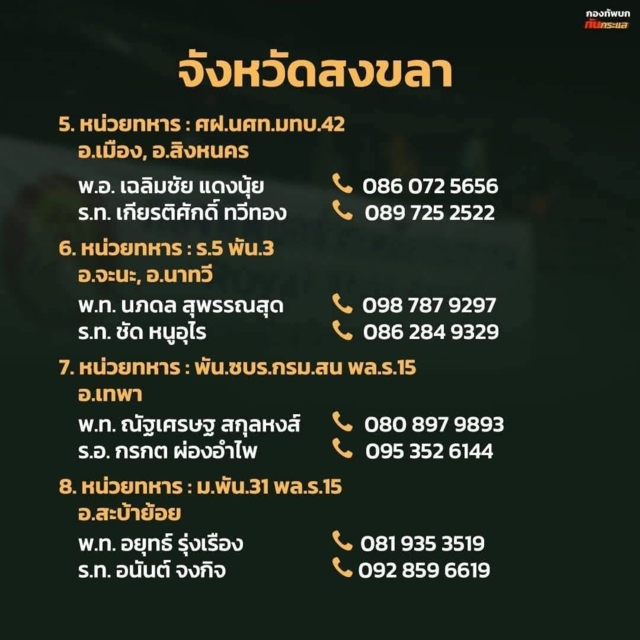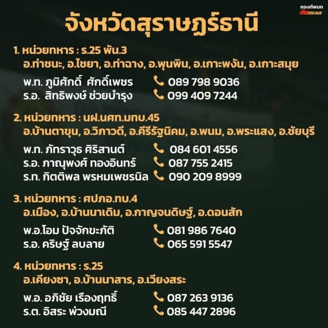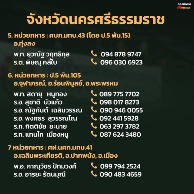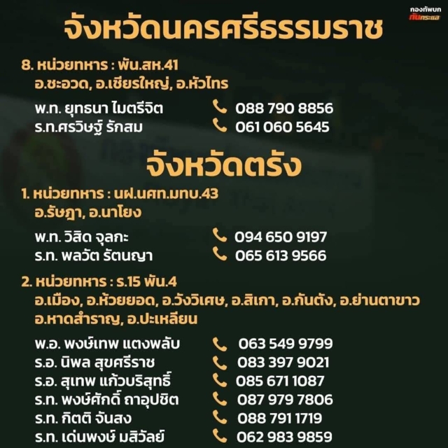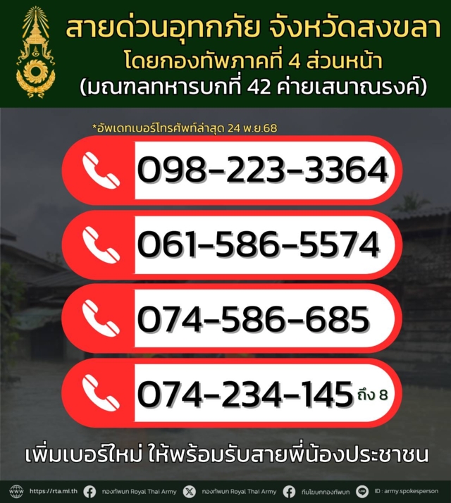 จากสถานการณ์อุทกภัยในพื้นที่ภาคใต้ในหลายจังหวัด ซึ่งอยู่ในจุดวิกฤต มีประชาชนติดค้างในพื้นที่น้ำท่วมจำนวนมาก ทางเพจ กองทัพบก ทันกระแส ได้รวมเบอร์สายตรงขอความช่วยเหลือผู้ประสบภัยน้ำท่วม ในพื้นที่ 14 จังหวัดภาคใต้ ซึ่งหากต้องการความช่วยเหลือด่วนจากเจ้าหน้าที่ สามารถโทรติดต่อได้ตามหมายเลขประจำพื้นที่