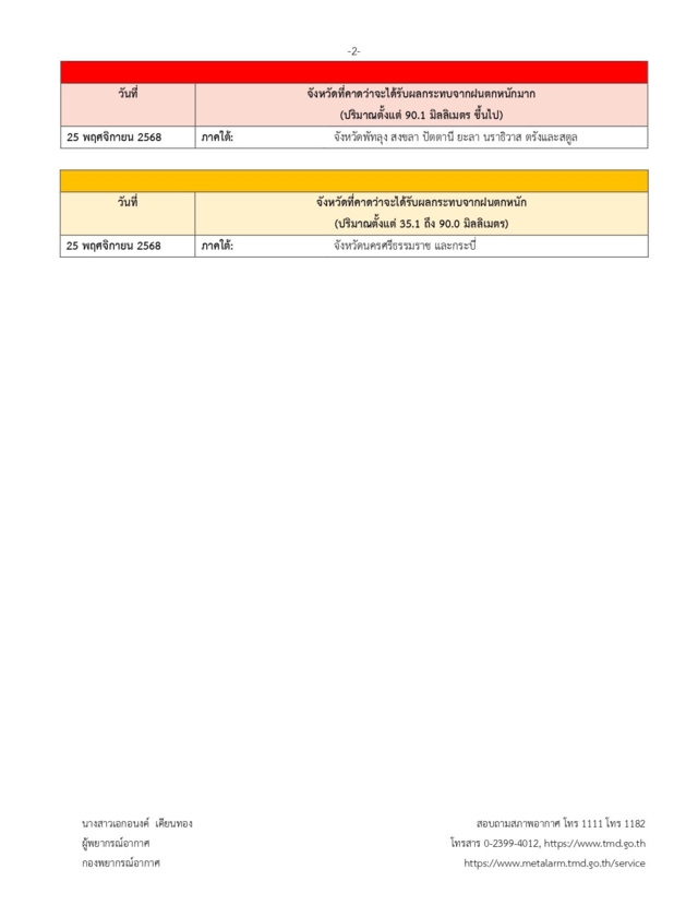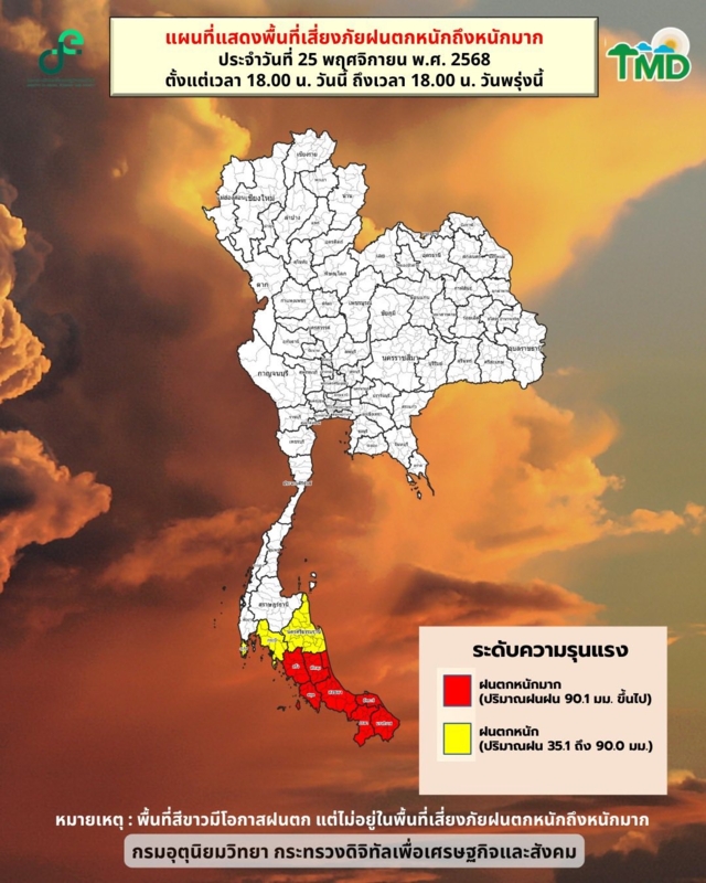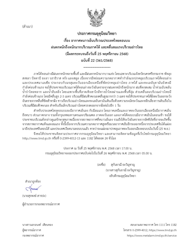 กรมอุตุนิยมวิทยา ประกาศเตือน เรื่อง อากาศหนาวเย็นบริเวณประเทศไทยตอนบน ฝนตกหนักถึงหนักมากบริเวณภาคใต้ และคลื่นลมแรงบริเวณอ่าวไทย (มีผลกระทบจนถึงวันที่ 25 พ.ย. 2568) ฉบับที่ 22 ภาคใต้ตอนล่างมีฝนตกหนักหลายพื้นที่ และมีฝนตกหนักมากบางแห่ง โดยเฉพาะบริเวณจังหวัดนครศรีธรรมราช พัทลุง สงขลา ปัตตานี ยะลา นราธิวาส ตรัง และสตูล เนื่องจากมีหย่อมความกดอากาศต่ำกำลังแรงปกคลุมบริเวณภาคใต้ตอนล่าง และประเทศมาเลเซีย ประกอบกับมรสุมตะวันออกเฉียงเหนือที่พัดปกคลุมอ่าวไทย ภาคใต้ และทะเลอันดามันยังคงมี กำลังค่อนข้างแรง