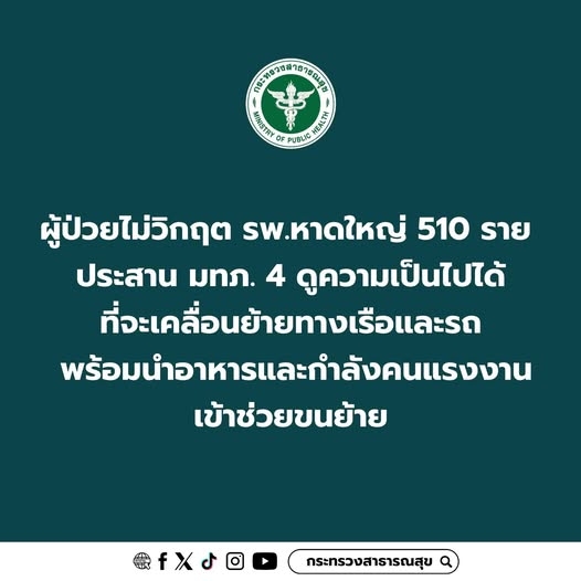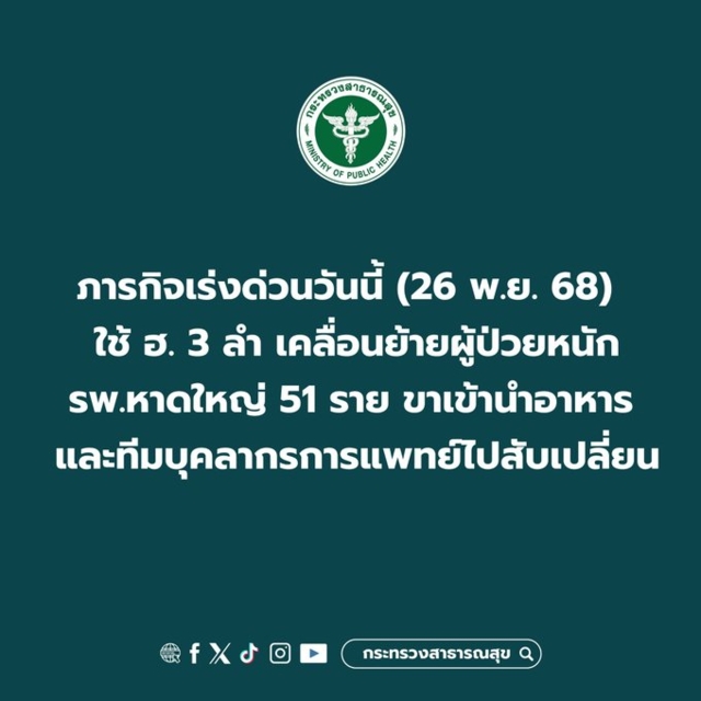 ล่าสุด กระทรวงสาธารณสุข เปิดเผย ว่า ภารกิจเร่งด่วน ในวันนี้ (26 พ.ย.) จะใช้ ฮ. 3 ลำ ในการเคลื่อนย้ายผู้ป่วยหนัก จาก รพ.หาดใหญ่ 51 ราย พร้อมนำอาหาร และบุคลากรแพทย์ไปสับเปลี่ยน