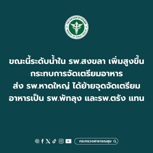 พร้อมกันนั้น จะประสาน มทภ.4 ดูแลความเป็นไปได้ ในการเคลื่อนย้ายผู้ป่วยไม่วิกฤต อีก 510 คน ด้วยรถและเรือออกมาว่าเป็นไปได้หรือไม่ ขณะนี้ระดับน้ำในรพ.สงขลา เพิ่มสูงขึ้น กระทบการจัดเตรียมอาหารส่ง รพ.หาดใหญ่ ได้ย้ายจุดจัดเตรียมอาหารเป็นรพ.พัทลุง และรพ.ตรัง แทน