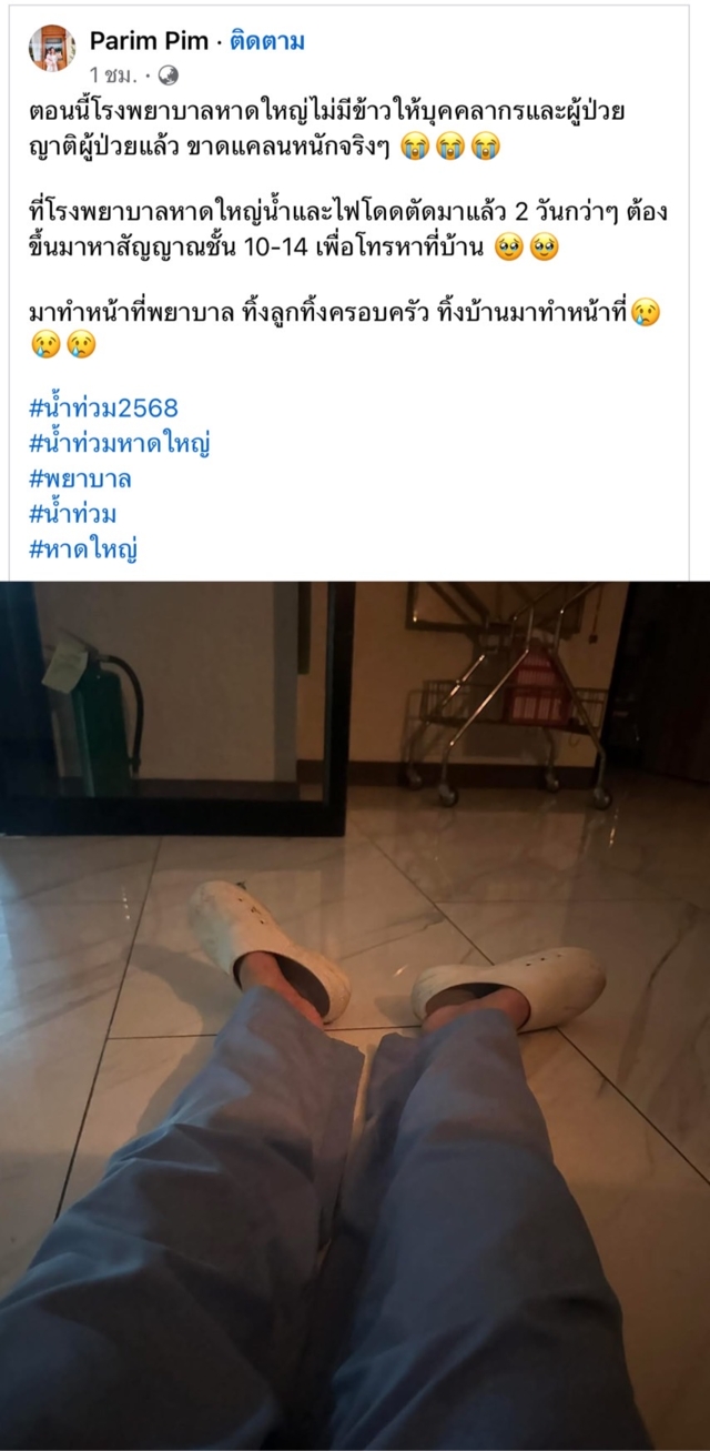 ที่โรงพยาบาลหาดใหญ่น้ำและไฟโดนตัดมาแล้ว 2 วันกว่าๆ ต้องขึ้นมาหาสัญญาณชั้น 10-14 เพื่อโทรหาที่บ้าน 🥹🥹 มาทำหน้าที่พยาบาล ทิ้งลูกทิ้งครอบครัว ทิ้งบ้านมาทำหน้าที่😢😢😢