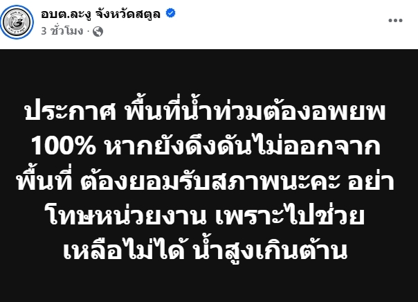 เฟซบุ๊ก อบต.ละงู จังหวัดสตูล ได้ออกประกาศว่า พื้นที่น้ำท่วมต้องอพยพ 100% หากยังดึงดันไม่ออกจากพื้นที่ ต้องยอมรับสภาพนะคะ อย่าโทษหน่วยงาน เพราะไปช่วยเหลือไม่ได้ น้ำสูงเกินต้าน