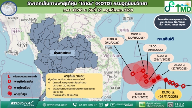 กรมอุตุนิยมวิทยา ประกาศเตือน เรื่อง พายุ "โคโตะ" และอากาศหนาวเย็นบริเวณประเทศไทยตอนบน ฉบับที่ 2 (มีผลกระทบตั้งแต่วันที่ 27-30 พ.ย. 2568) พายุโซนร้อนกำลังแรง "โคโตะ" (KOTO) บริเวณทะเลจีนใต้ตอนกลาง ได้ทวีกำลังขึ้นเป็นพายุไต้ฝุ่นแล้ว โดยเมื่อเวลา 04.00 น. ของวันนี้ (27 พ.ย. 2568) มีศูนย์กลางอยู่ที่ละติจูด 13.1 องศาเหนือ ลองจิจูด 114.3 องศาตะวันออก ความเร็วลมสูงสุดใกล้ศูนย์กลางประมาณ 139 กิโลเมตรต่อชั่วโมง กำลังเคลื่อนตัวทางทิศตะวันตกค่อนไปทางเหนือเล็กน้อย ด้วยความเร็วประมาณ 15 กิโลเมตรต่อชั่วโมง ในขณะที่บริเวณความกดอากาศสูงหรือมวลอากาศเย็นปกคลุมบริเวณประเทศเวียดนามและทะเลจีนใต้ คาดว่าพายุนี้จะอ่อนกำลังลงอย่างรวดเร็วบริเวณชายฝั่งประเทศเวียดนามตอนใต้ โดยพายุนี้ไม่เคลื่อนเข้าสู่ประเทศไทย
