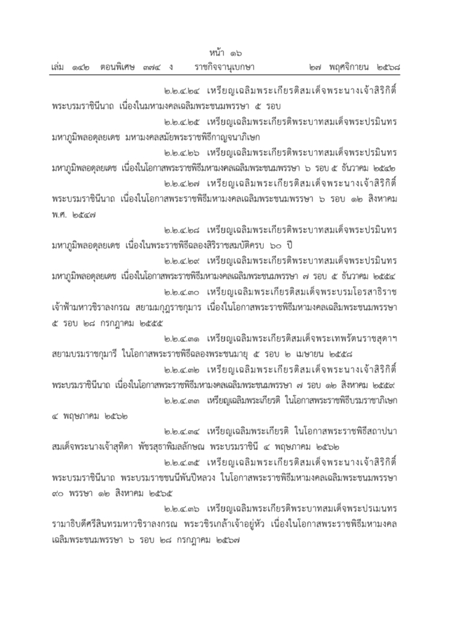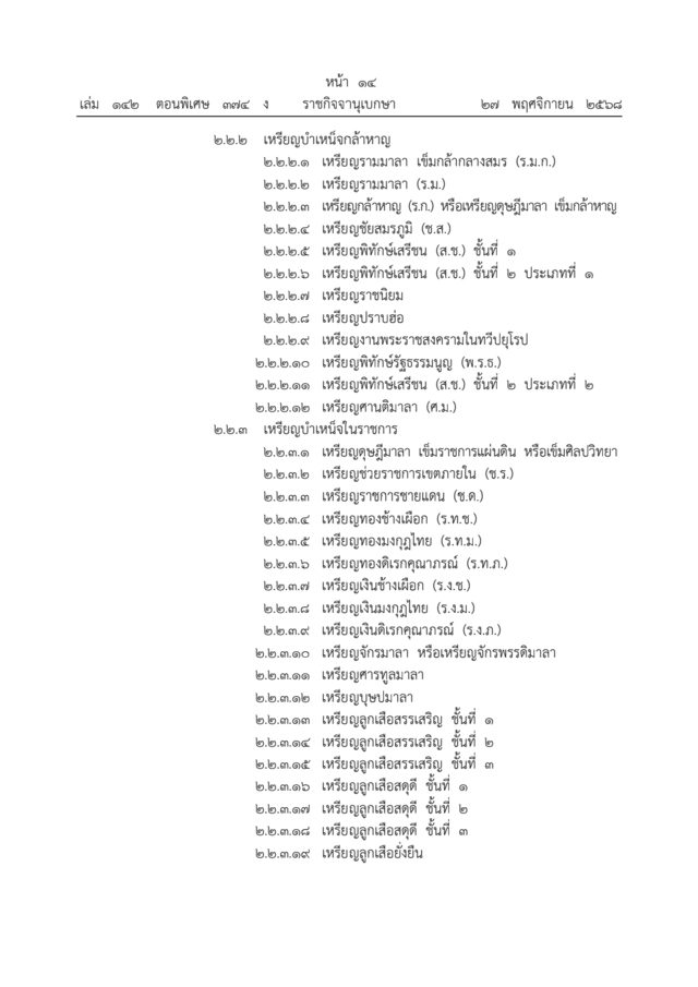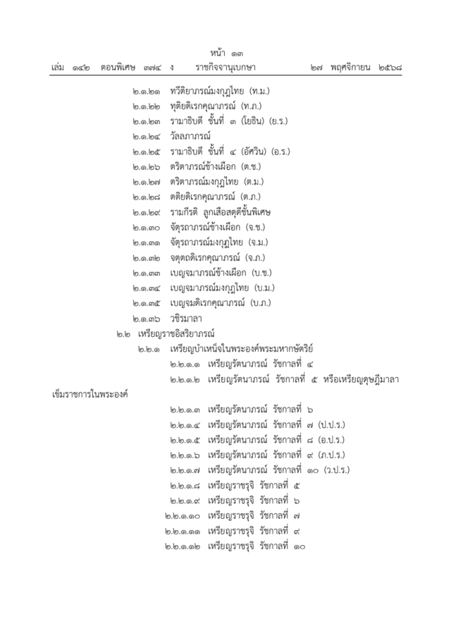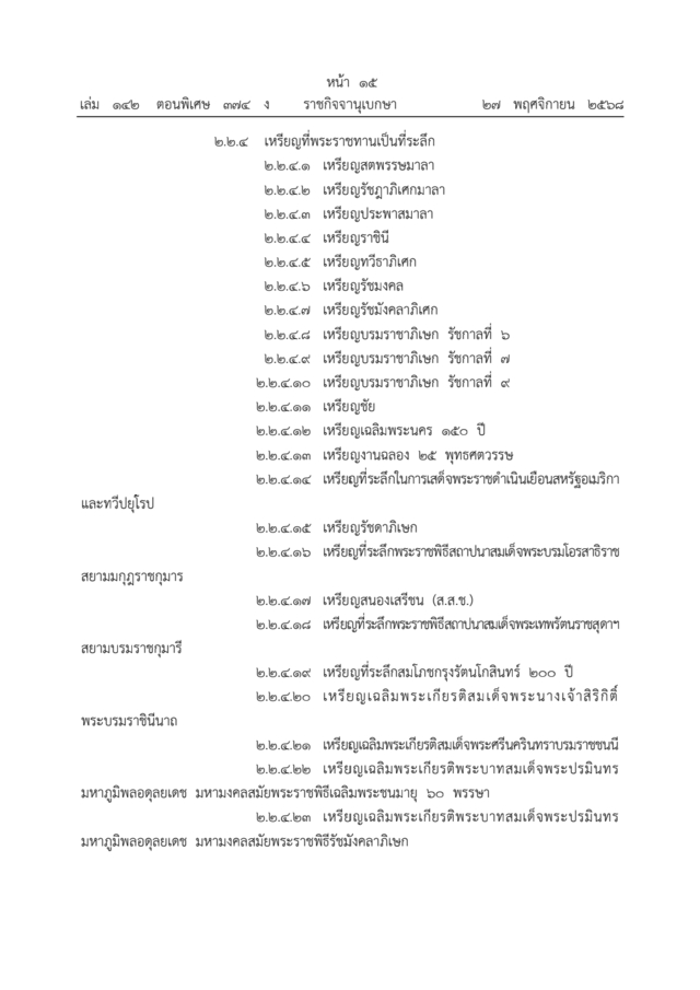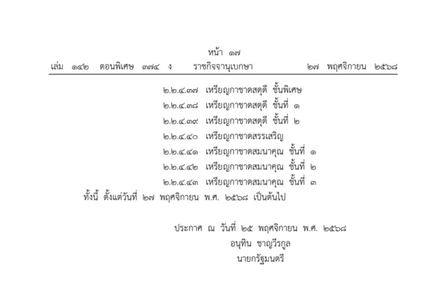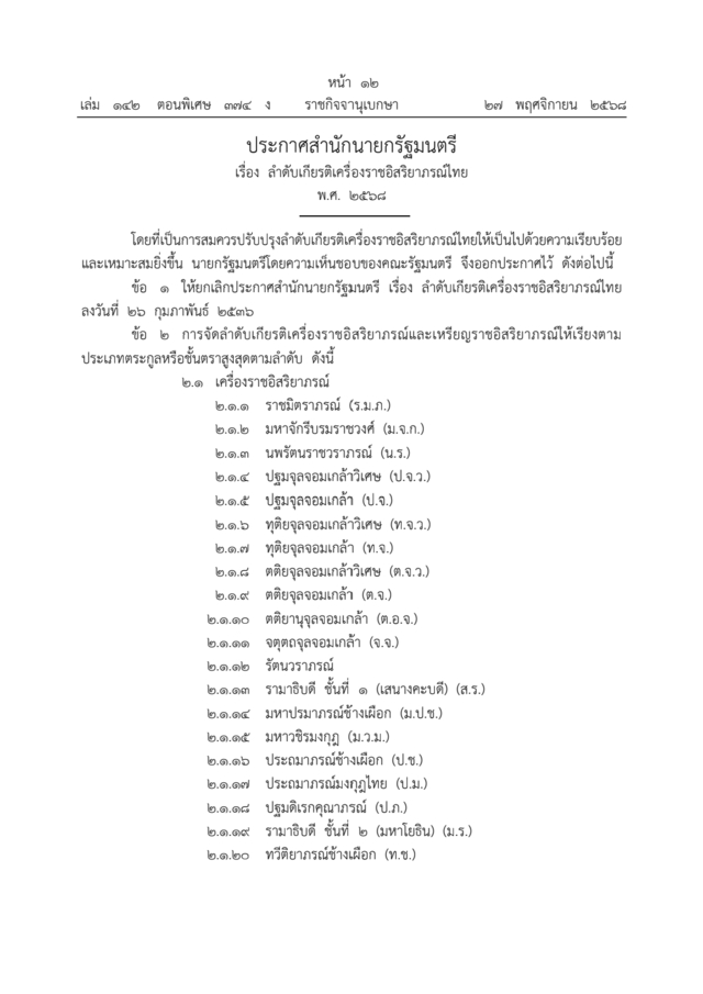 ราชกิจจานุเบกษา เล่ม 142 ตอนพิเศษ 374 ง. หน้า 12-17 ลงวันที่ 27 พฤศจิกายน 2568 ออกประกาศ สำนักนายกรัฐมนตรี เรื่อง ลำดับเกียรติเครื่องราชอิสริยาภรณ์ไทย พ.ศ. 2568 ลงนามโดย นายอนุทิน ชาญวีรกูล นายกรัฐมนตรี โดยที่เป็นการปรับปรุงลำดับเกียรติเครื่องราชอิสริยาภรณ์ไทยให้เป็นไปด้วยความเรียบร้อยและเหมาะสมยิ่งขึ้น นายกรัฐมนตรีโดยความเห็นชอบของคณะรัฐมนตรี จึงออกประกาศไว้ดังต่อไปนี้ โดยแบ่งเป็น 1. เครื่องราชอิสริยาภรณ์ และ 2. เหรียญราชอิสริยาภรณ์ ซึ่งเรียงตามตระกูลหรือชั้นตราสูงสุดตามลำดับ ตามประกาศดังนี้