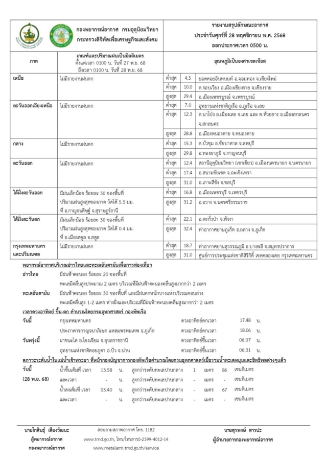 โดยในวันที่ 28-29 พ.ย. 2568 ไทยตอนบนอากาศเย็นถึงหนาว ลมแรง ภาคเหนือ ภาคกลาง กทม.ปริมณฑลอุณหภูมิลดอีก 1-2 องศาเซลเซียส ยอดดอย–ยอดภูหนาวจัด ต่ำสุด 1-8 องศาเซลเซียส มีน้ำค้างแข็งบางพื้นที่ ยอดภู ต่ำสุด 4-13 องศาเซลเซียส