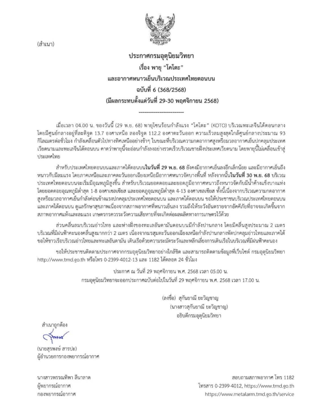 กรมอุตุนิยมวิทยา ประกาศเตือน เรื่อง พายุ "โคโตะ" และอากาศหนาวเย็นบริเวณประเทศไทยตอนบน ฉบับที่ 6 (มีผลกระทบตั้งแต่วันที่ 29 - 30 พ.ย. 2568) เมื่อเวลา 04.00 น. ของวันนี้ (29 พ.ย. 2568) พายุโซนร้อนกำลังแรง "โคโตะ" (KOTO) บริเวณทะเลจีนใต้ตอนกลางโดยมีศูนย์กลางอยู่ที่ละติจูด 13.7 องศาเหนือ ลองจิจูด 112.2 องศาตะวันออก ความเร็วลมสูงสุดใกล้ศูนย์กลางประมาณ 93 กิโลเมตรต่อชั่วโมง กำลังเคลื่อนตัวไปทางทิศเหนืออย่างช้าๆ ในขณะที่บริเวณความกดอากาศสูงหรือมวลอากาศเย็นปกคลุมประเทศเวียดนามและทะเลจีนใต้ตอนบน คาดว่าพายุนี้จะอ่อนกำลังลงอย่างรวดเร็วบริเวณชายฝั่งประเทศเวียดนาม โดยพายุนี้ไม่เคลื่อนเข้าสู่ประเทศไทย