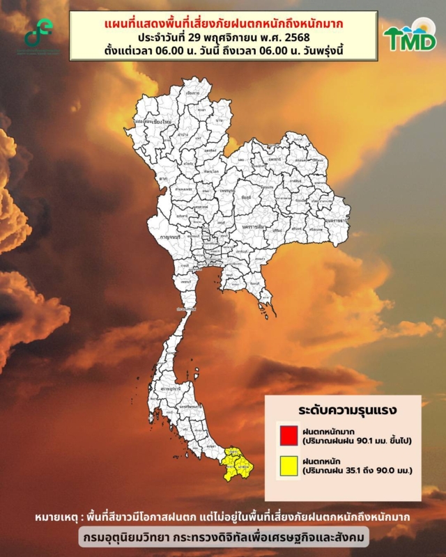 สำหรับประเทศไทยตอนบนและภาคใต้ตอนบนในวันที่ 29 พ.ย. 2568 ยังคงมีอากาศเย็นลงอีกเล็กน้อย และมีอากาศเย็นถึงหนาวกับมีลมแรง โดยภาคเหนือและภาคตะวันออกเฉียงเหนือมีอากาศหนาวจัดบางพื้นที่ หลังจากนั้นในวันที่ 30 พ.ย. 2568 บริเวณประเทศไทยตอนบนจะเริ่มมีอุณหภูมิสูงขึ้น สำหรับบริเวณยอดดอยและยอดภูมีอากาศหนาวถึงหนาวจัดกับมีน้ำค้างแข็งบางแห่ง โดยยอดดอยอุณหภูมิต่ำสุด 1-8 องศาเซลเซียส และยอดภูอุณหภูมิต่ำสุด 4-13 องศาเซลเซียส ทั้งนี้เนื่องจากบริเวณความกดอากาศสูงหรือมวลอากาศเย็นกำลังค่อนข้างแรงปกคลุมประเทศไทยตอนบน และภาคใต้ตอนบน ขอให้ประชาชนบริเวณประเทศไทยตอนบนและภาคใต้ตอนบน ดูแลรักษาสุขภาพเนื่องจากสภาพอากาศที่หนาวเย็นลง รวมถึงให้ระวังอันตรายจากอัคคีภัยที่อาจจะเกิดขึ้นจากสภาพอากาศแห้งและลมแรง เกษตรกรควรระวังความเสียหายที่จะเกิดต่อผลผลิตทางการเกษตรไว้ด้วย