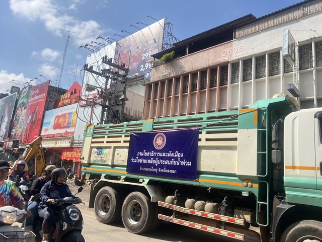 ขณะที่กรมโยธาธิการและผังเมือง ได้ส่งเครื่องจักรหนักสนับสนุน โดยแบ่งเป็น 3 ชุด สำหรับชุดที่ 1 ประกอบไปด้วยรถน้ำ 5 คัน รถ JBC 1 คัน รถหกล้อ 6 คัน ปฏิบัติงานเขต 1 ถนนนวลแก้ว สำหรับชุดที่ 2 รถน้ำ 4 คัน รถตัก 2 คัน รถหกล้อ 5 คัน ปฎิบัติภารกิจเขต 3 โซนร้านอาหารเรือนเพชรหมูกระทะ ส่วนชุดที่ 3 ประกอบไปด้วยรถน้ำ 4 คัน รถหกล้อ 5 คัน รถตัก 2 คัน ปฎิบัติหน้าที่เขต4 สะพานดำเขต 8 ซึ่งภารกิจส่วนใหญ่พบว่าเป็นการตักเศษซากสิ่งของ นำขึ้นรถ 6 ล้อ โดยเบื้องต้นเทศบาลนครหาดใหญ่ ได้จัดพื้นที่สำหรับการทิ้งไว้ที่บริเวณ ที่ถนนราษฎ์อุทิศ ทางเข้าเขต8 ซึ่งพื้นที่ดังกล่าวเป็นลานกว้าง คาดว่าจะสามารถรองรับสิ่งของที่เสียหายได้เป็นจำนวนมาก